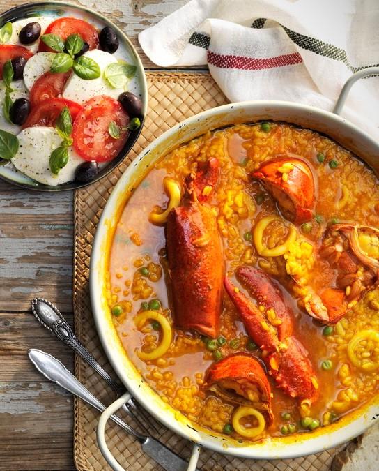 Arroz caldoso de bogavante y ensalada mediterránea