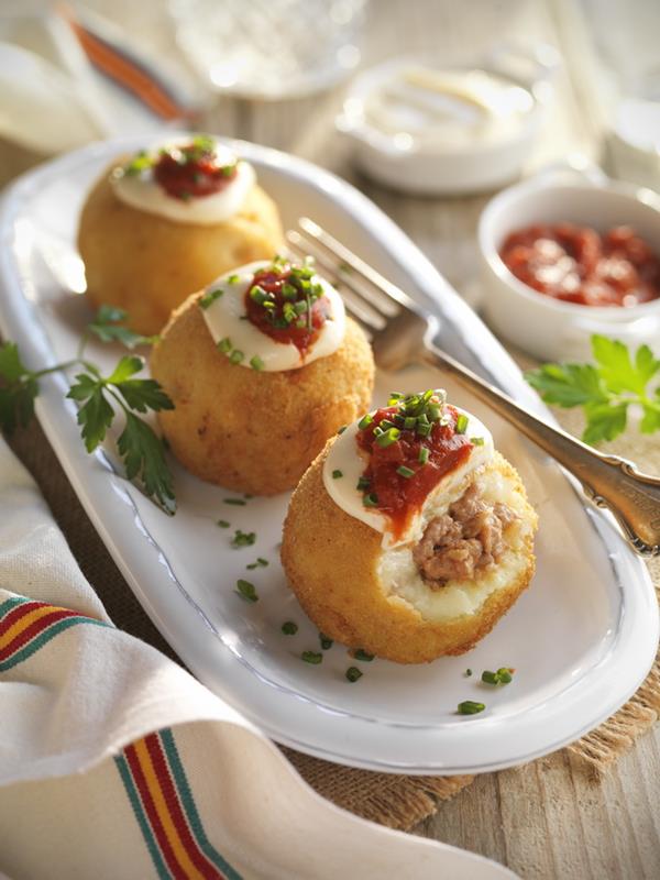 Corta cuadraditos de 15cm*15cm del papel film y coloca sobre la mesa. Reparte sobre los cuadrados 2 cucharadas de puré de patata en cada una y dar forma de cuadrado, haz un hueco en el medio del puré y pon allí la carne. Para cerrar cómodamente las bolas, levanta delas puntas del film y gira para cerrar los paquetito, cuando tenga forma de bola, quita el film y termina de bolear con las manos aceitosas. Empana las bolas pasando por harina, huevo batido y pan rallado. Fríe las bolas en abundante cantidad de aceite de freír a 180 grados hasta que estén dorados y crujientes, escurre bien sobre papel de cocina y sirve con el alioli y la salsa brava.