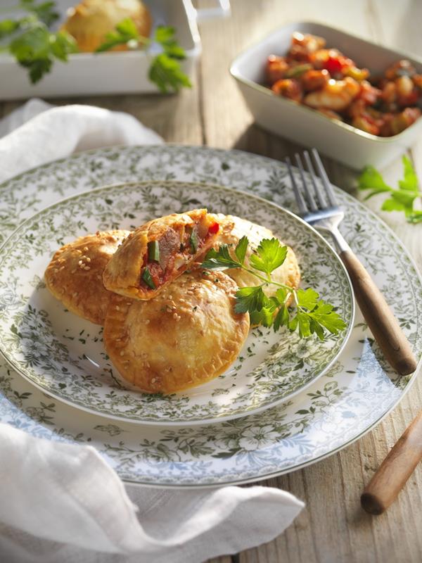 Enharina una superficie y con el rodillo extiende la masa de empanada. Con un aro de cm de diámetro corta discos. Pinta los discos con huevo batido y pon en la mitad de los discos 2 cucharadas de pisto. Coloca de tapa otro disco sin pisto, aprieta los bordes primero con los dedos y luego repasa con un tenedor. Pinta la superficie también con huevo y espolvorea con semillas de sésamo.