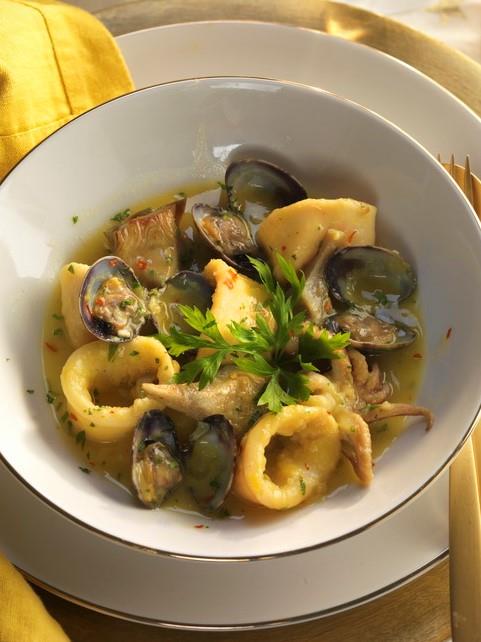 En una cazuela calienta 2 cucharadas de aceite de oliva y rehoga la cebolla picada durante 4 minutos, añade el ajo picado y las hebras de azafrán, 20 g de harina y rehoga 1 minuto más. Añade los trozos de calamar y alcachofas fritas y añade el vino blanco y el caldo de pescado y deja cocer a fuego lento 20 minutos condimenta con sal y pimienta negra recién molida y añade las almejas escurridas. Deja cocer 5 minutos más, espolvorea con el perejil picado y sirve bien caliente.