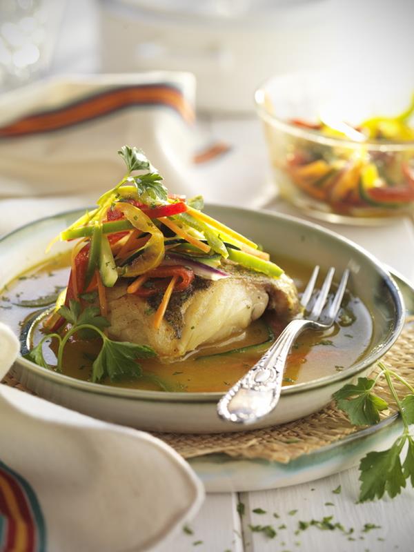 Condimenta los filetes de merluza con sal y calienta una sartén con 2 cucharadas de aceite de oliva. Coloca los filetes de merluza en la sartén caliente con la parte de la piel hacia abajo y cocina unos 3 minutos hasta que la piel esté dorada y crujiente dar la vuelta a los filetes y cocinar 1 minutos más. Añadir el curri a la sartén y rehogar en el aceite rápidamente y añadir el caldo de pescado. Dejar reducir el caldo hasta la mitad a fuego fuerte y comprobar el puno de sal. Para servir colocar el filete de merluza en el centro del plato sobre la salsa y poner encima las verduras salteadas.