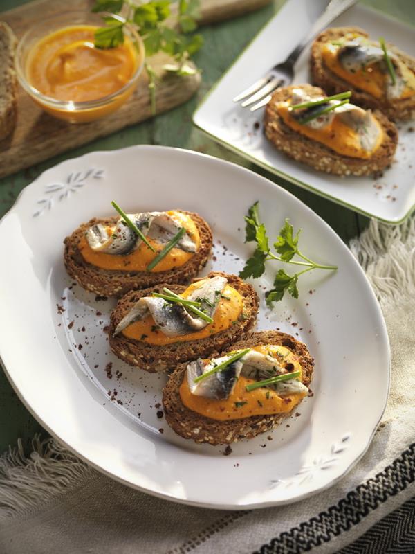Cortar la barra de pan de semillas en rodajas y tostar al horno precalentado a 200 grados durante 8 minutos, hasta que estén dorados y crujientes. Sacar y untar con el salmorejo y colocar un filete de boquerón enrollado por encima. Decorar con unos bastones de cebollino y granitos rotos de pimienta rosa.