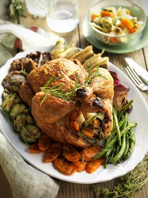 redondas de zanahoria hasta que se doren y condimenta con las ramitas de romero, sal y pimienta negra recién molida. Rellena el pollo con la verdura salteada apretando bien el relleno hacia