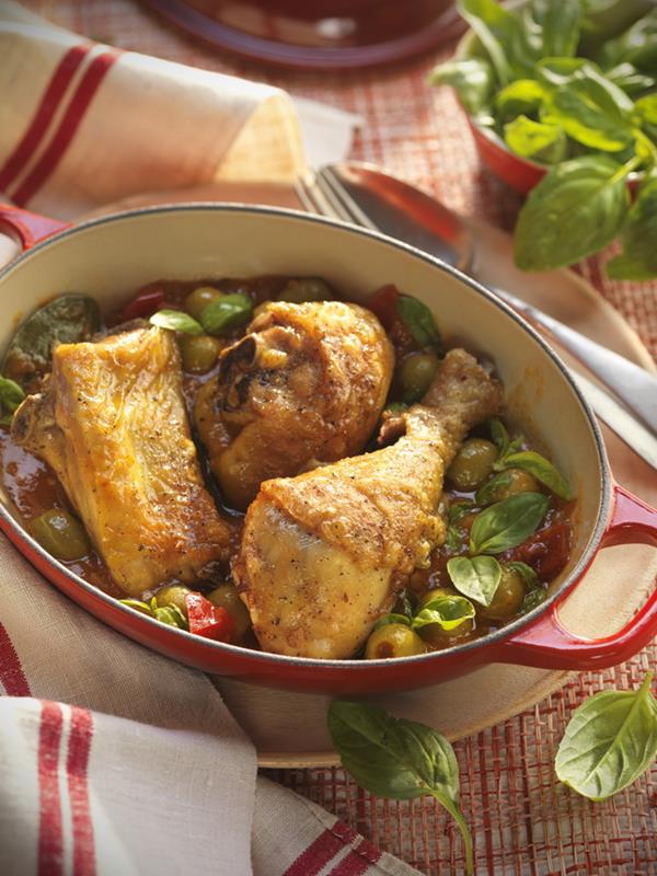 Pollo de corral asado con salsa de aceitunas