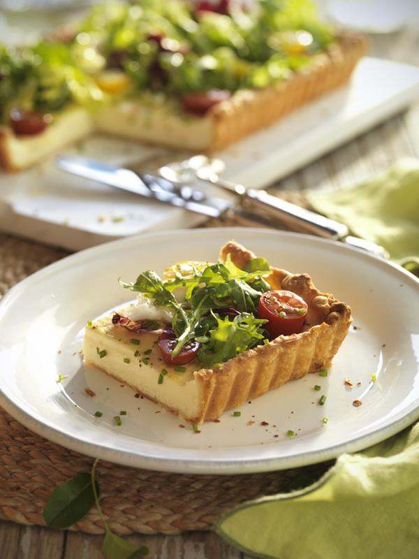 Quitar los garbanzos y el papel del hojaldre y rellenar con la mezcla de queso y leche. Hornear a 180 grados 30 minutos. Sacar y dejar templar en temperatura de ambiente.