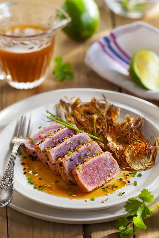 Tataki de atún con salsa de cítricos y chips de alcachofas