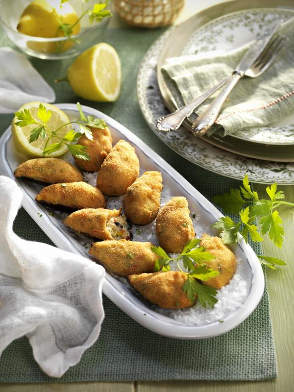 Separa las cascaras de mejillones y rellena cada media con una buena cucharada sopera de relleno y alisa la superficie con la ayuda de la cuchara. Empana la parte del relleno pasando por harina, huevo batido y pan rallado. Fríe en abundante cantidad de aceite de freír a 180 grados hasta dorar la superficie, escurrir bien y servir calientes con gajos de limón.
