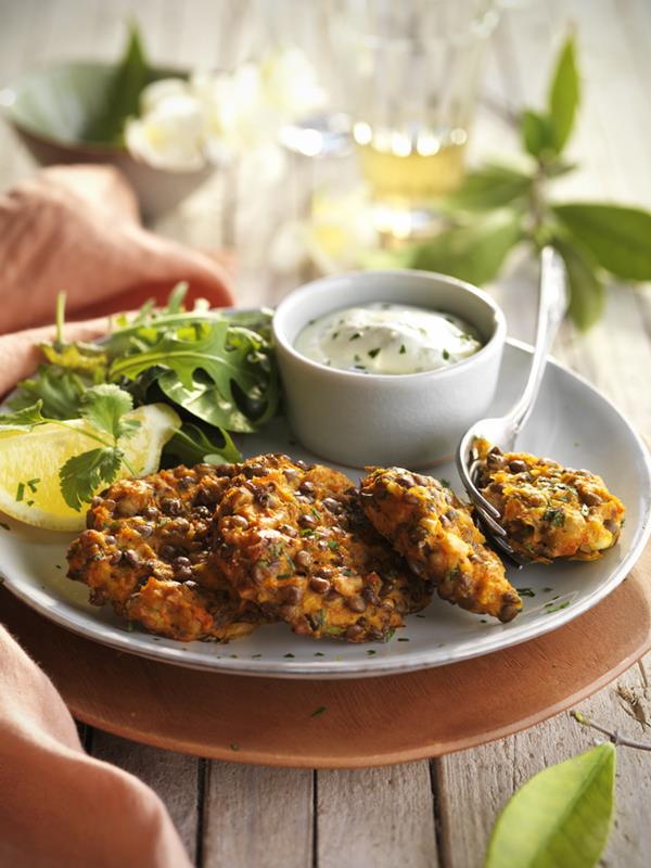 Aplasta la zanahoria cocida con un tenedor en un bol, añade las lentejas cocidas, el resto de las hojas de cilantro, una cucharada de harina, el huevo y los frutos secos picados. Condimenta con sal, pimienta negra recién molida y un chorrito de aceite de oliva. Mezcla bien y forma tortitas sobre una bandeja de hornear con papel de horno. Hornea las tortitas en horno precalentado a 180 grados unos 15 minutos, hasta que empiecen a estar doraditos. Sirve recién hechos acompañados de la salsa de yogur.
