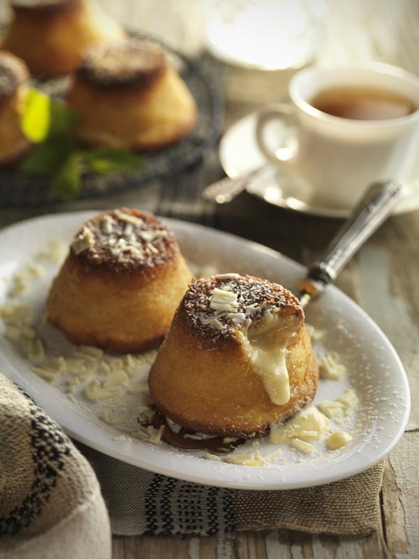 Täytä ¾ osaa muoteista taikinalla ja laita jokaisen siään 10 gramman palanen valkosuklaata. Paista esilämmitetyssä uunissa 180 asteessa 10 – 12 minuuttia ja tarjoile välittömästi.